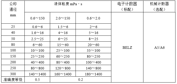 流量計一般按以下配置出廠,見下表中配套計數器型號及性能參數。