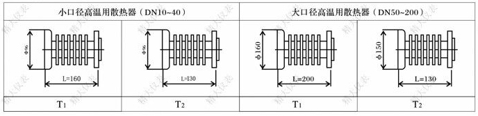 型號中出現T2為高溫流量計,用于60-120℃帶發(fā)信器,配置短性散熱器。