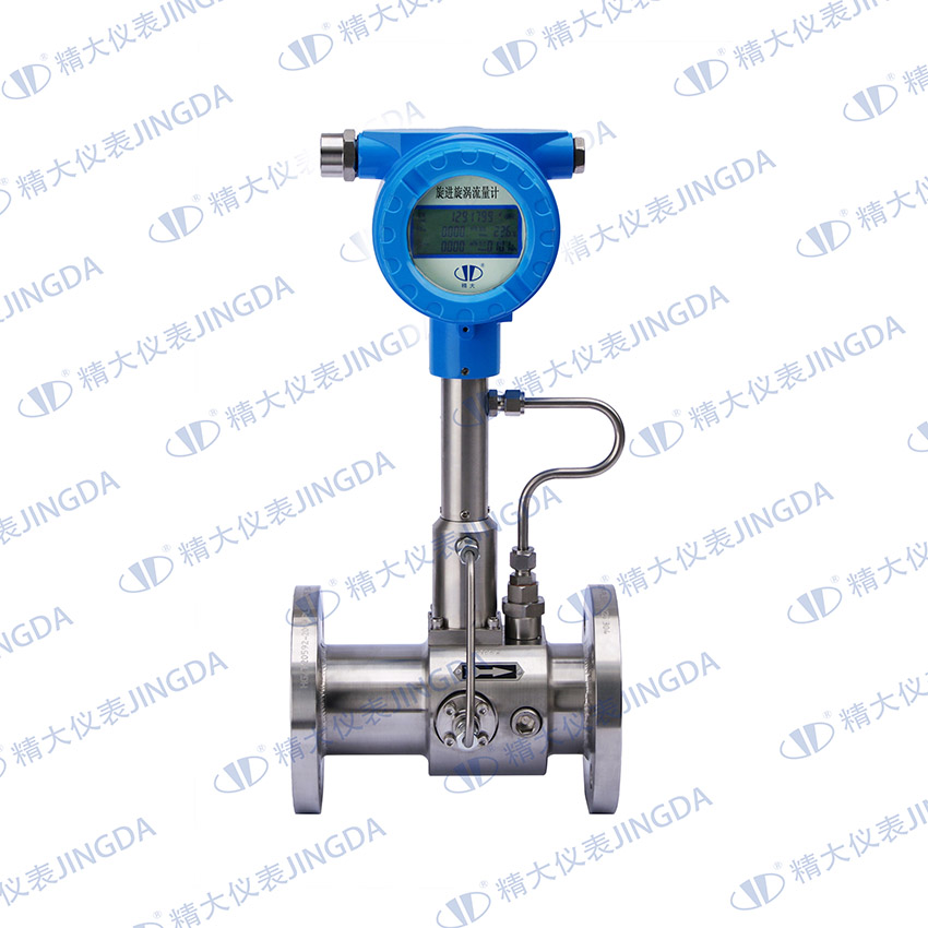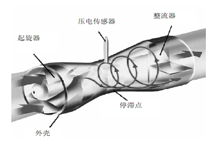當沿著軸向流動的流體進入流量計入口時,螺旋形葉片強迫流體進行旋轉運動,于是在旋渦發生體中心產生螺旋流,旋渦流在文丘利管中旋進,到達收縮段后,因回流作用強迫進行旋進式二次旋轉。此時旋渦流的旋轉頻率與介質流速成正比,并為線性。兩個壓電傳感器檢測的微弱電荷信號同時經前置放大器放大、濾波、整形處理后,變成兩路頻率與流速成正比的脈沖信號進行比較和判斷,剔除干擾信號,并同固定在殼體上的溫度傳感器、壓力傳感器檢測到溫度、壓力信號一起,送入智能化積算儀進行運算處理,即可求得流量及相關數據。